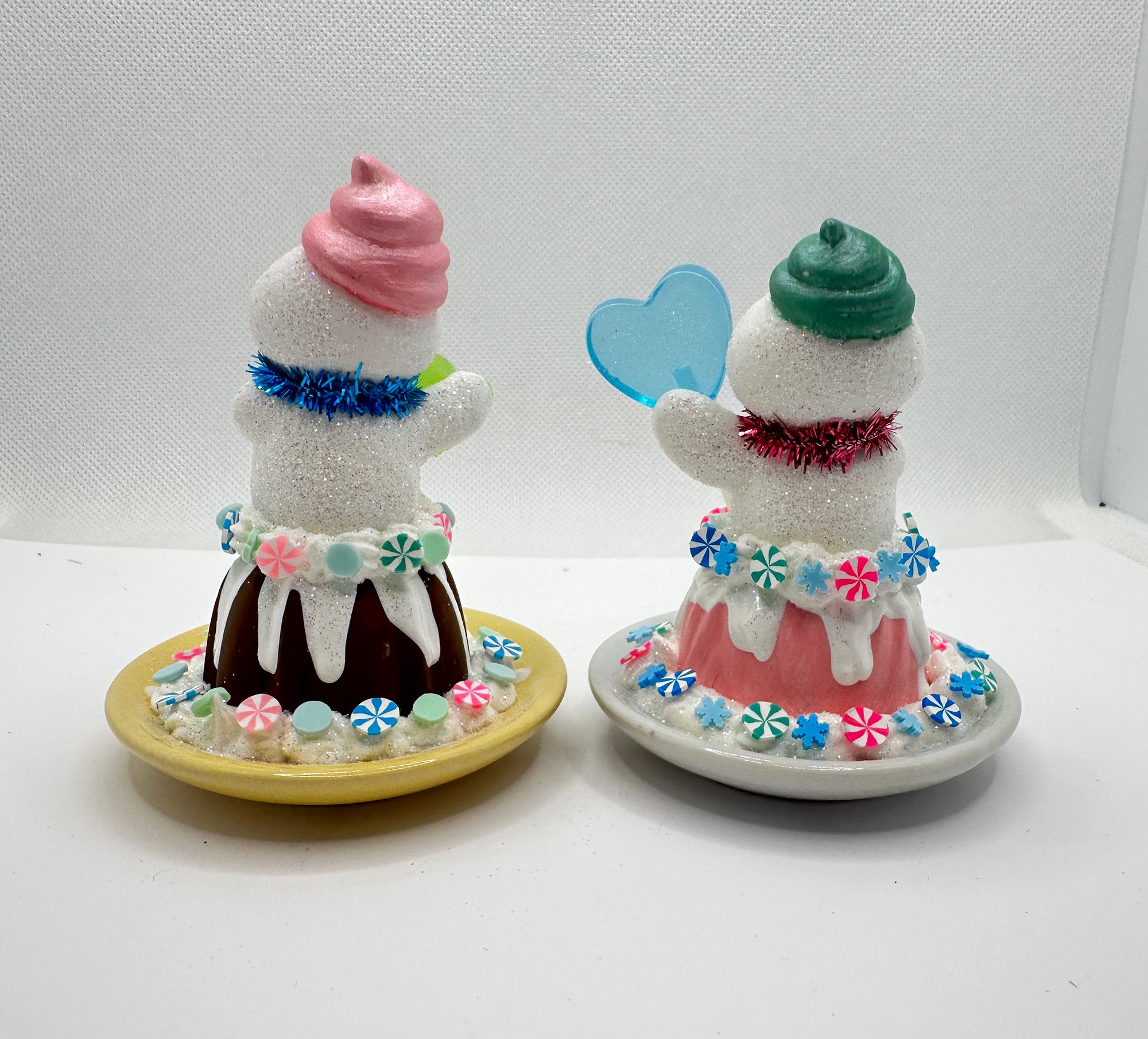Bundt Cake Snowmen Desserts are crafted using a real mini bundt cake pan, featuring adorable candy-themed snowmen that emerge from the top. These delightful desserts will add a touch of joy and sweetness to your holiday decor. Each piece is meticulously hand-created, ensuring that no two are exactly alike. They come signed, accompanied by a certificate of authenticity, and packaged in a box, making them perfect for gifting or storing.