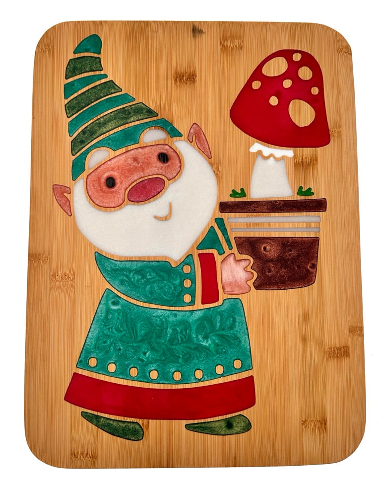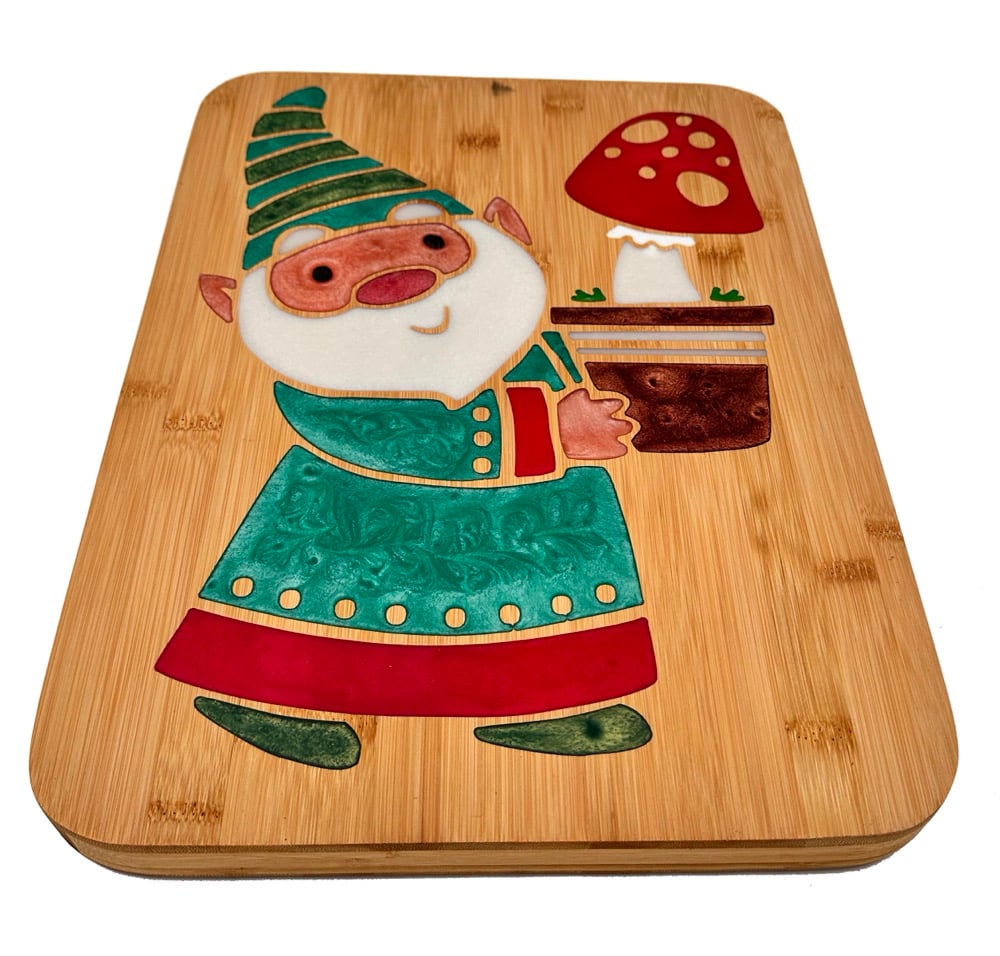 Add a dash of whimsy to your next party with the gnome charcuterie board. CNC carved and filled in with vibrant epoxy resin, this gnome is such to bring smiles and spark conversation! Food safe and ready to serve your favorite cheeses, fruits or desserts. Each board is designed by hand and one of a kind.