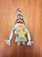 The gnomes are handpainted on fabric then sewn together and dressed with recycled sweaters and attachments. Each one is unique.