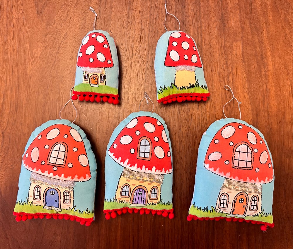 The mushrooms are like tiny pillows with an original painting on them, sewn together and stuffed.
