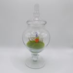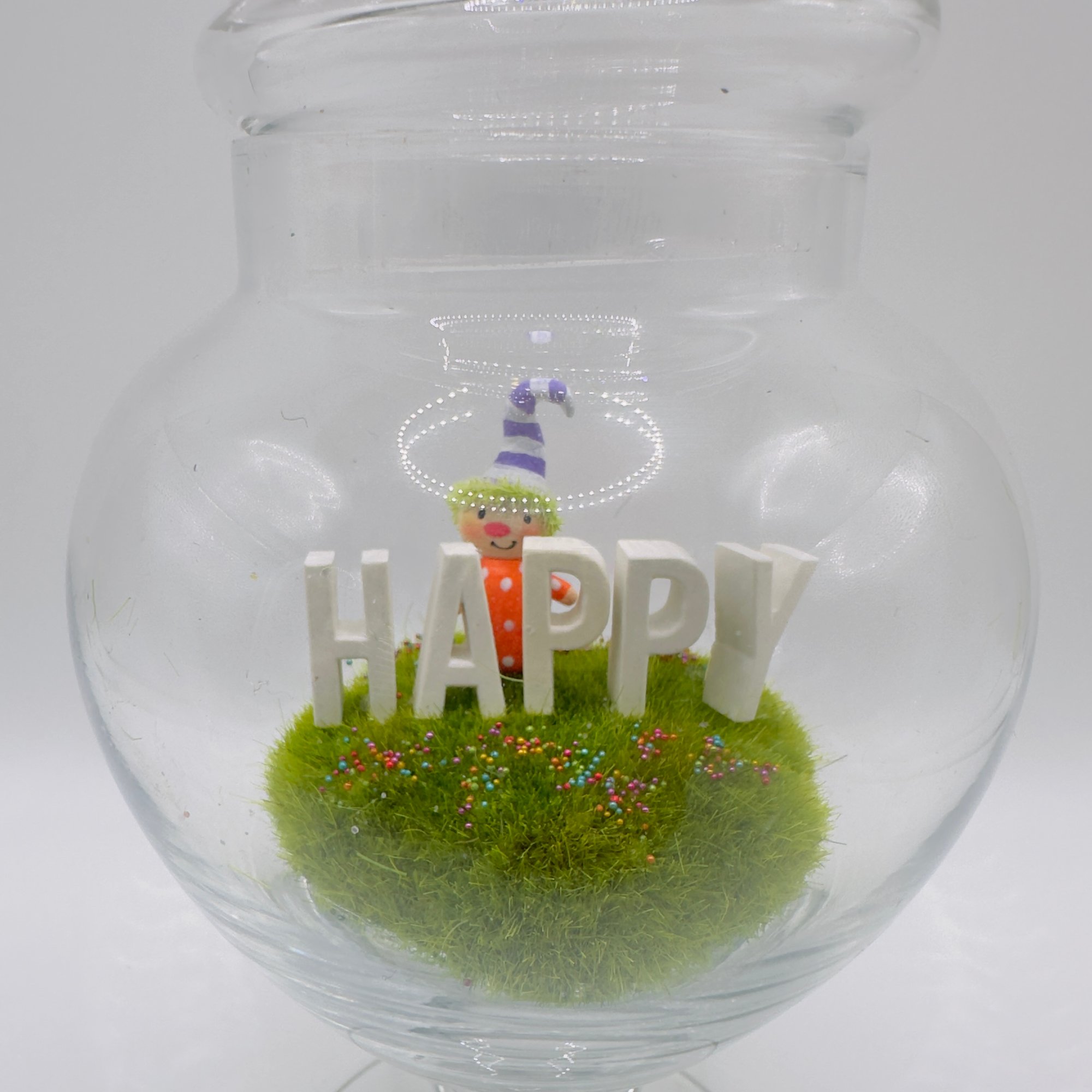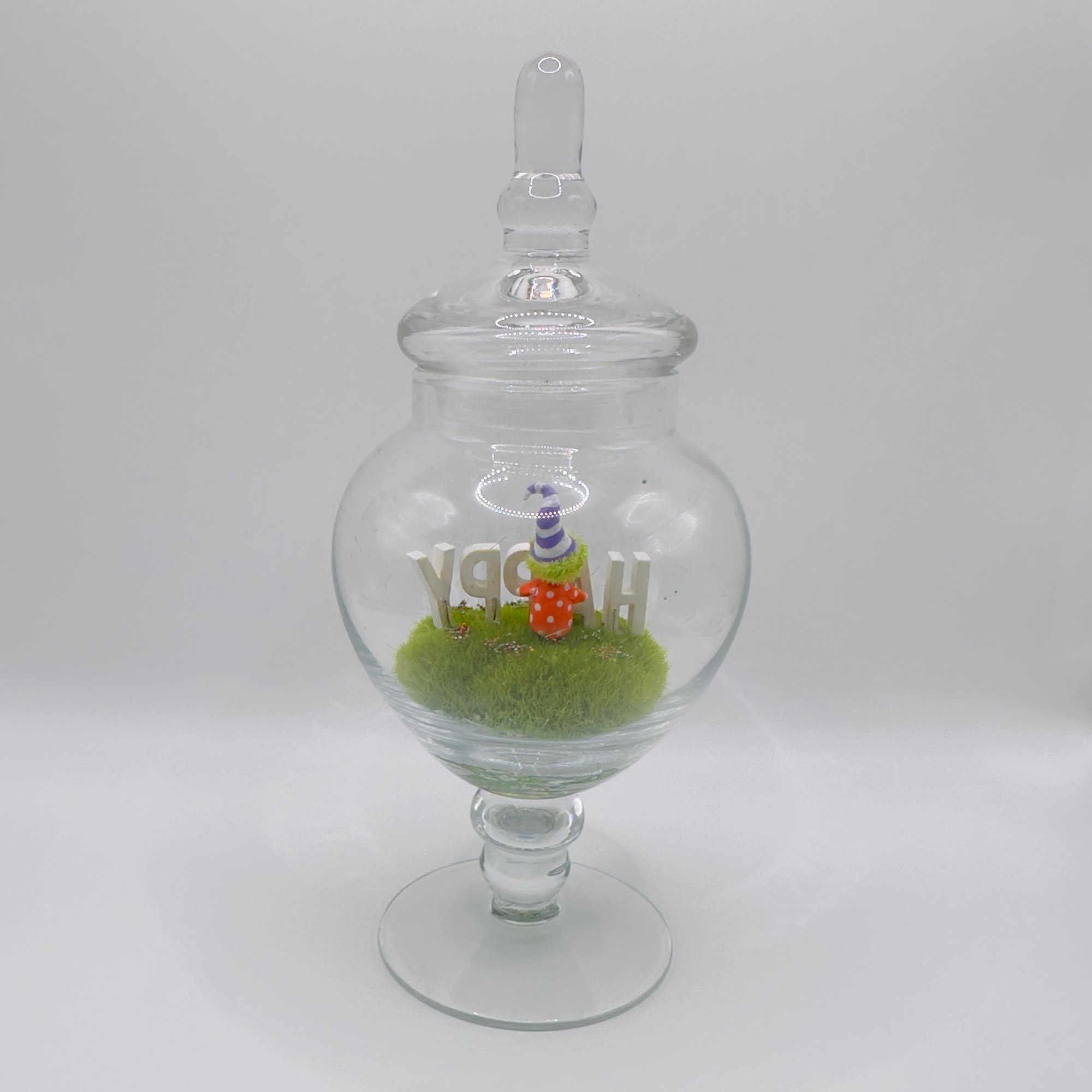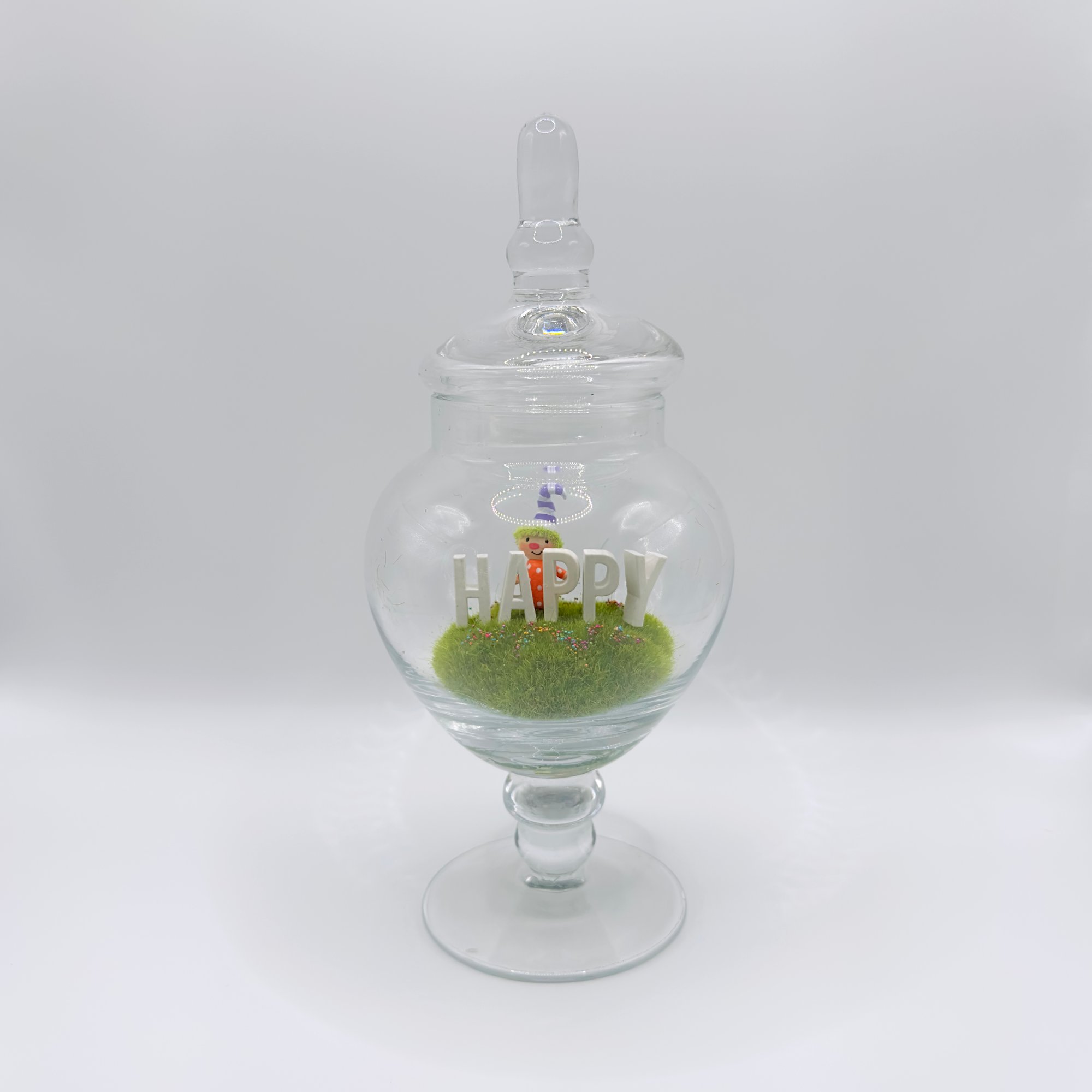 This vintage Work of Whimsy Happy gnome terrarium is from the beginning days of my studio. It is in a found glass container and the gnome is painted paper clay and the lettering is vintage porcelain signage pieces which are tucked into faux grass.