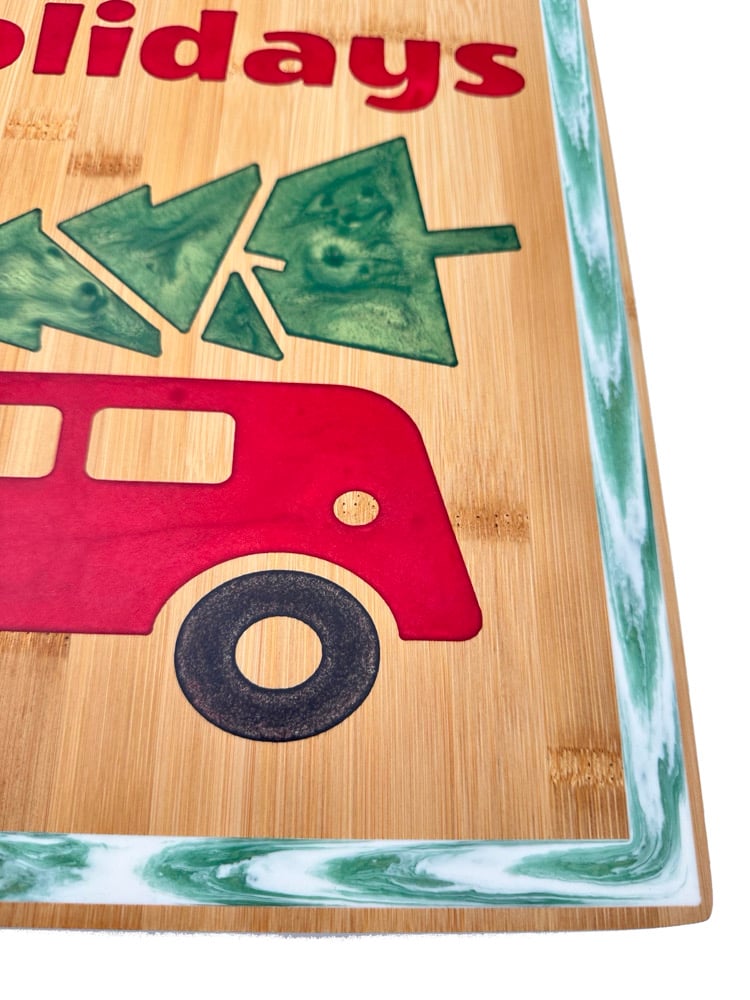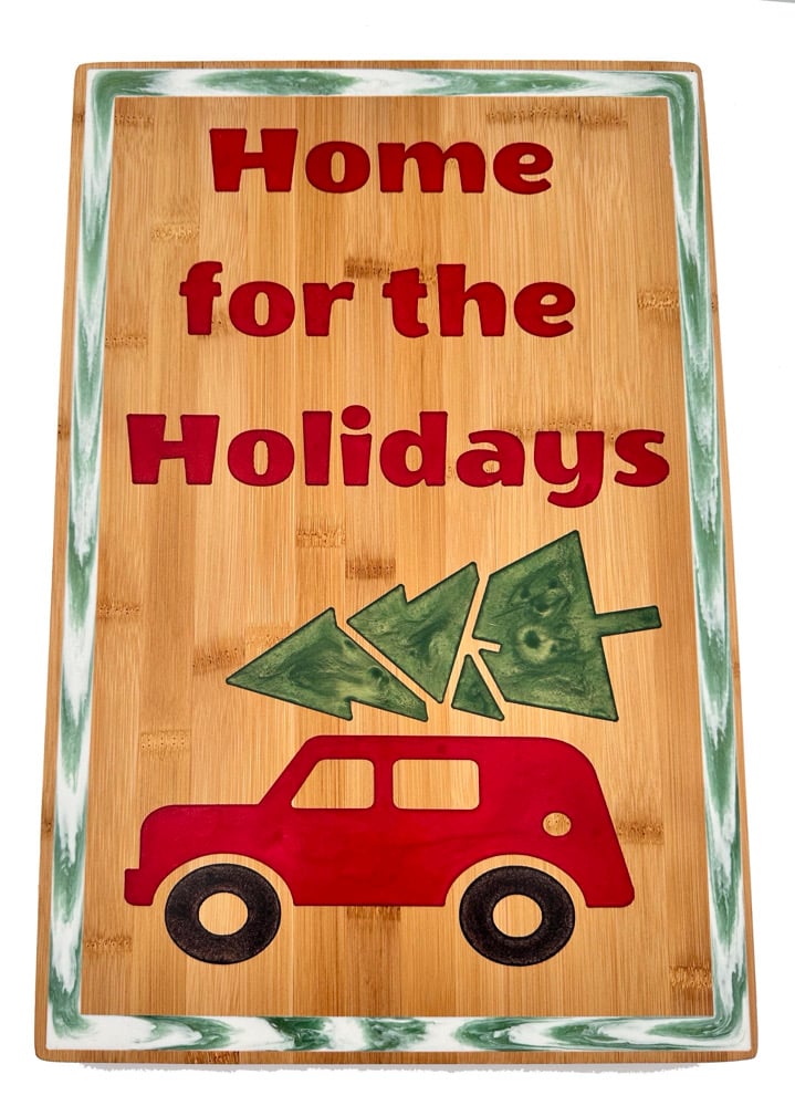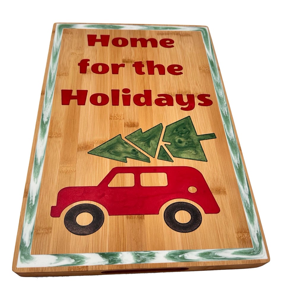 Celebrate being home for the holidays with this beautifully handcrafted charcuterie board, designed to bring people together around good food and conversation. Made from bamboo wood and featuring a stunning epoxy resin inlay, the board is engraved with the meaningful words: Home for the Holidays.