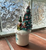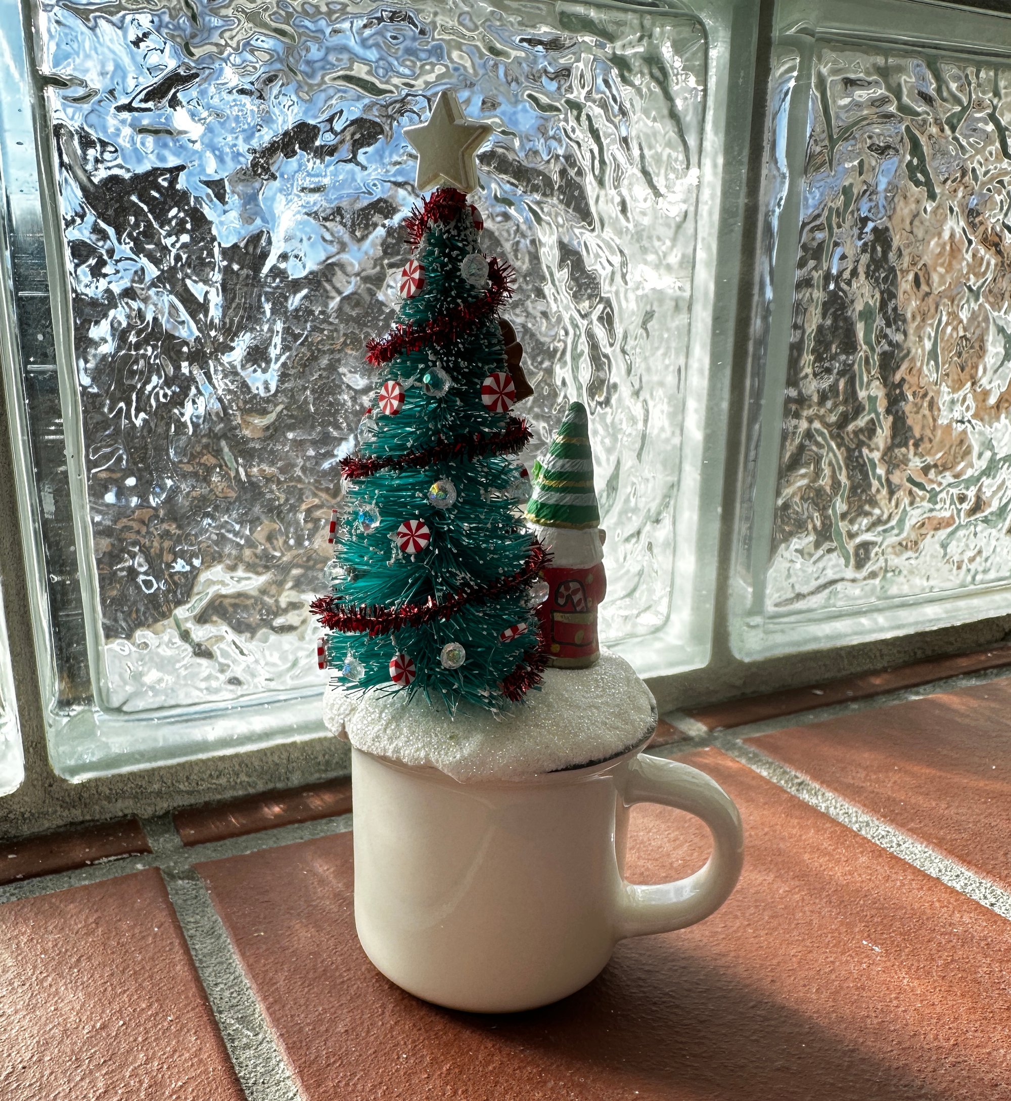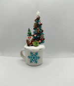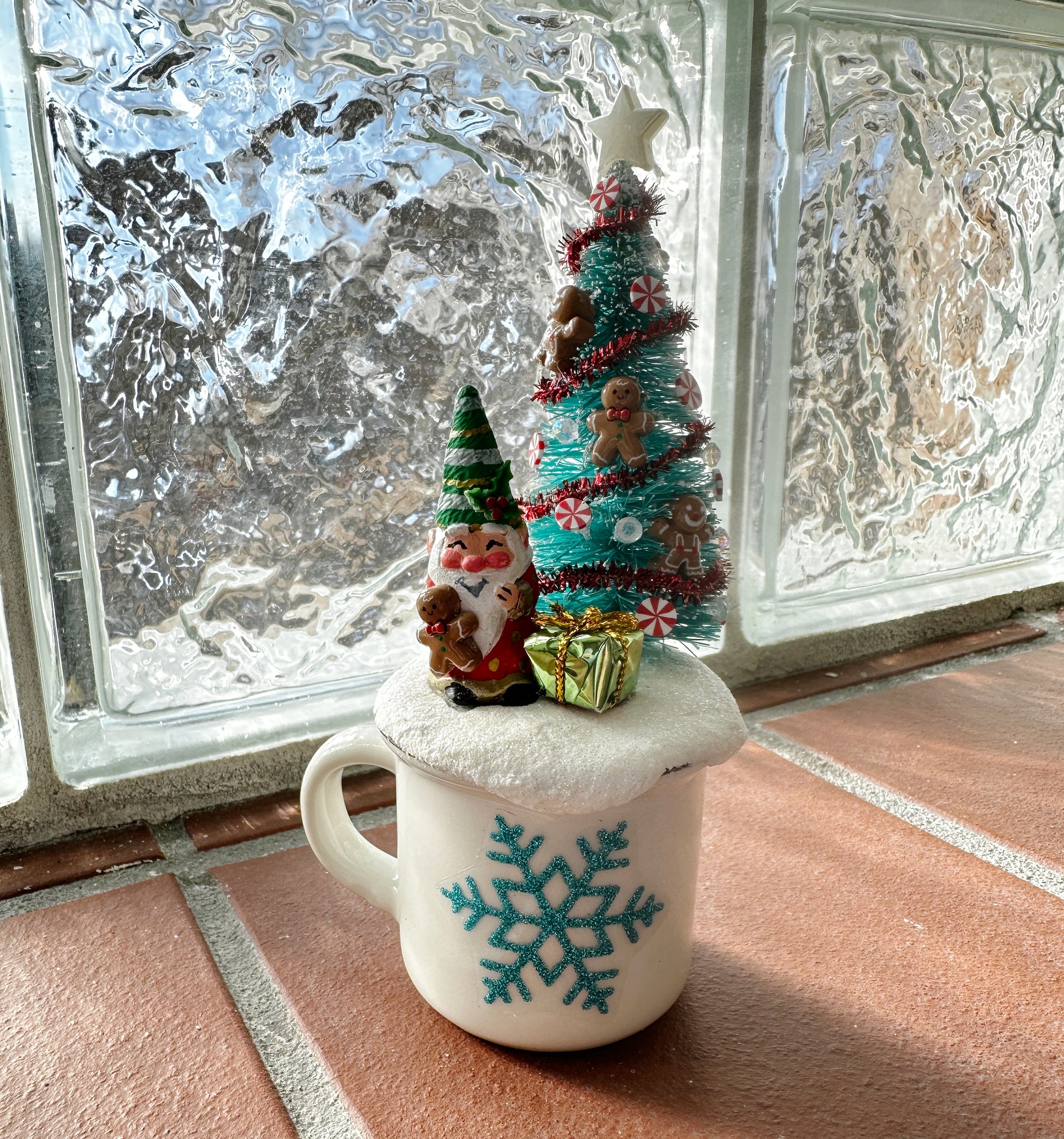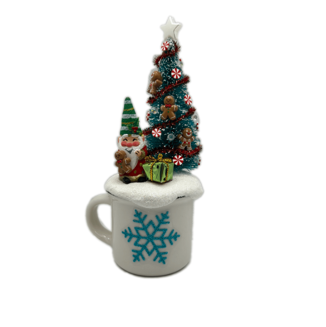 Lollipop Gnome with lollipop tree nestled in turquoise mug figurine is created in the color palette of blues and greens. This sweet gnome is so happy to decorate his tree with his favorite treats of lollipops and hard candies. This piece is a one-of-a-kind piece. No others will be made!