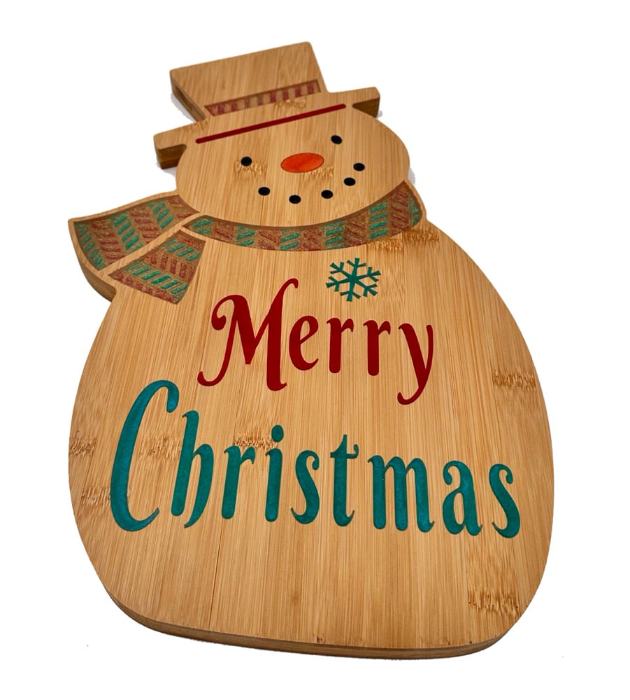 Add holiday cheer to your gatherings with this handcrafted snowman shaped charcuterie board. Expertly CNC carved with the words “Merry Christmas,” "Snow Sweet Snow," or "Let it Snow!", this charming board blends festive design with everyday functionality. Using epoxy resin, color is added to the board to bring out the carved design. Made from durable wood, it’s perfect for serving cheeses, meats, or desserts. Whether displayed as a Christmas decoration your kitchen or used as a serving board for Christmas parties, this snowman is sure to bring smiles and seasonal spirit. Select "Merry Christmas" or "Let it Snow" when ordering.