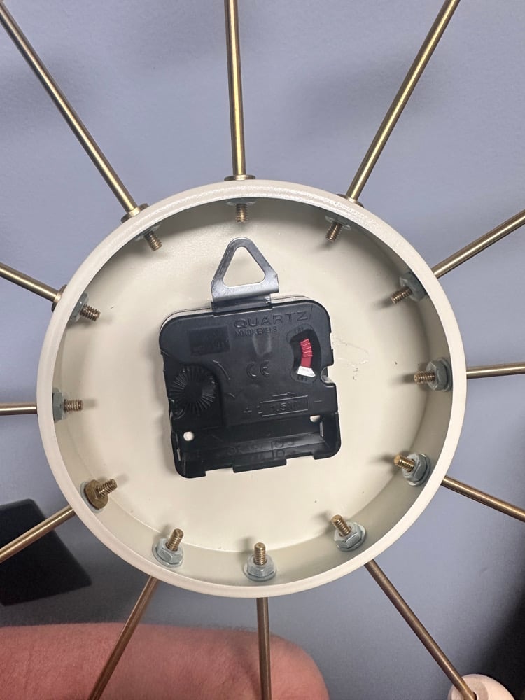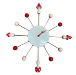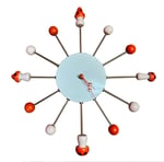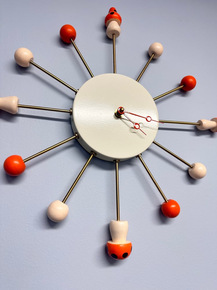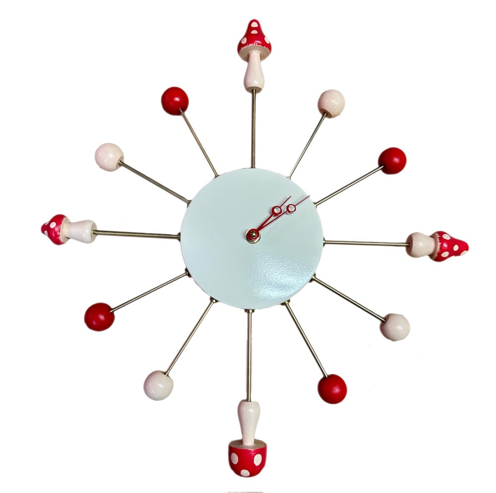 The Mushroom Clock is all about setting a vibe: a little retro, a little whimsical, a little fun yet meant to make a statement on your wall. This fully functional clock is handcrafted in our studio, featuring bold, sculptural mushroom spokes made out of wood and hand painted with color that evoke the retro cool energy of mid-century design. The body and rods of the clock are made of metal. Every clock is one of a kind and carefully assembled by hand, blending quality craftsmanship with artistic flair. When ordering, select orange or red for the color of the mushrooms.