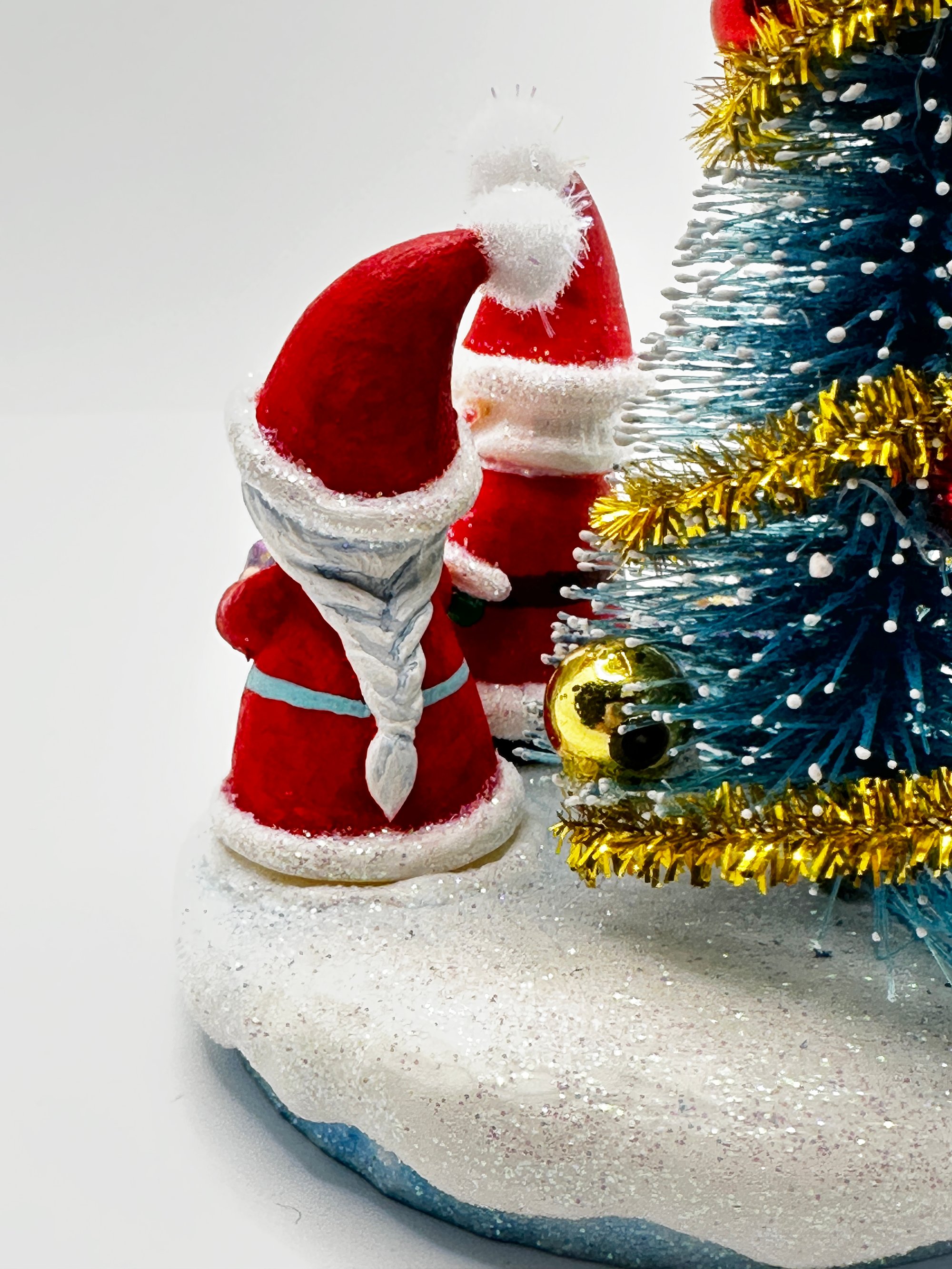 The Clauses are taking a brief break from their hectic holiday schedule to exchange Christmas wishes in front of their beautifully decorated tree. This limited edition piece is sure to add a touch of Christmas magic to your home. It comes signed and numbered with a certificate of authenticity and is packaged in a gift box.
