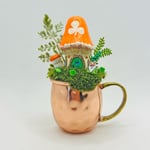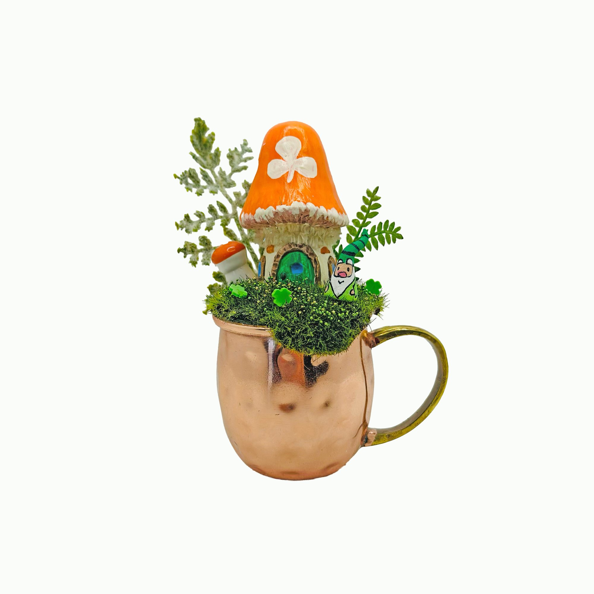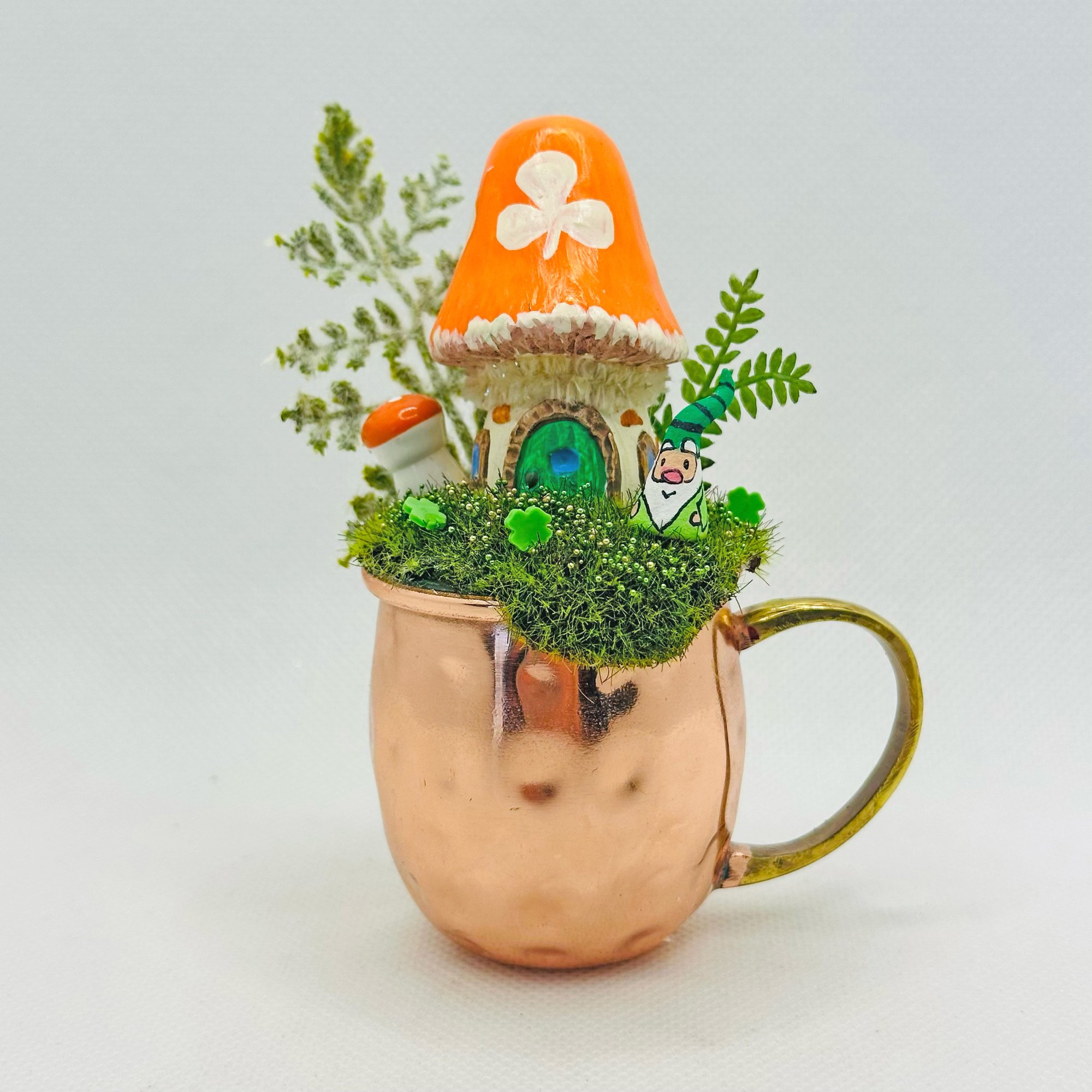 This St. Patrick's Day tabletop decor will bring cheer to your holiday celebration!! Nestled inside a shiny copper mug is a mushroom house and tiny little gnome that lives there. It is one of a kind and created by Tammy and is signed and comes with a certificate of authenticity.