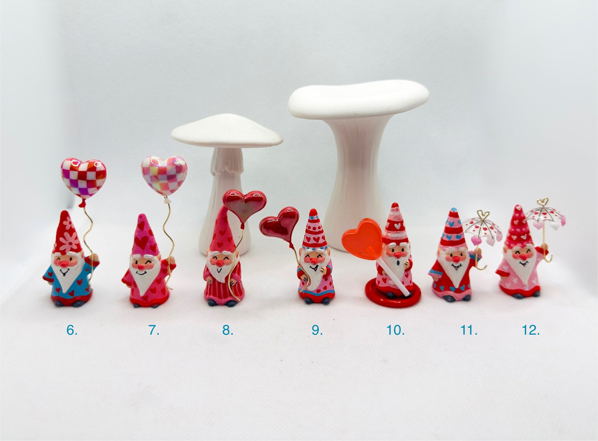 These Valentine’s Day Gnomes are bursting with love and ready to celebrate this special holiday with you! Each adorable little guy is one-of-a-kind, handpainted and hand-assembled with some of the most charming attachments. Each gnome is signed by Tammy, comes with a certificate of authenticity, and a box perfect for storing or gifting. When ordering, please choose 1 through 12 for which gnome you’d like to purchase and share the holiday with.