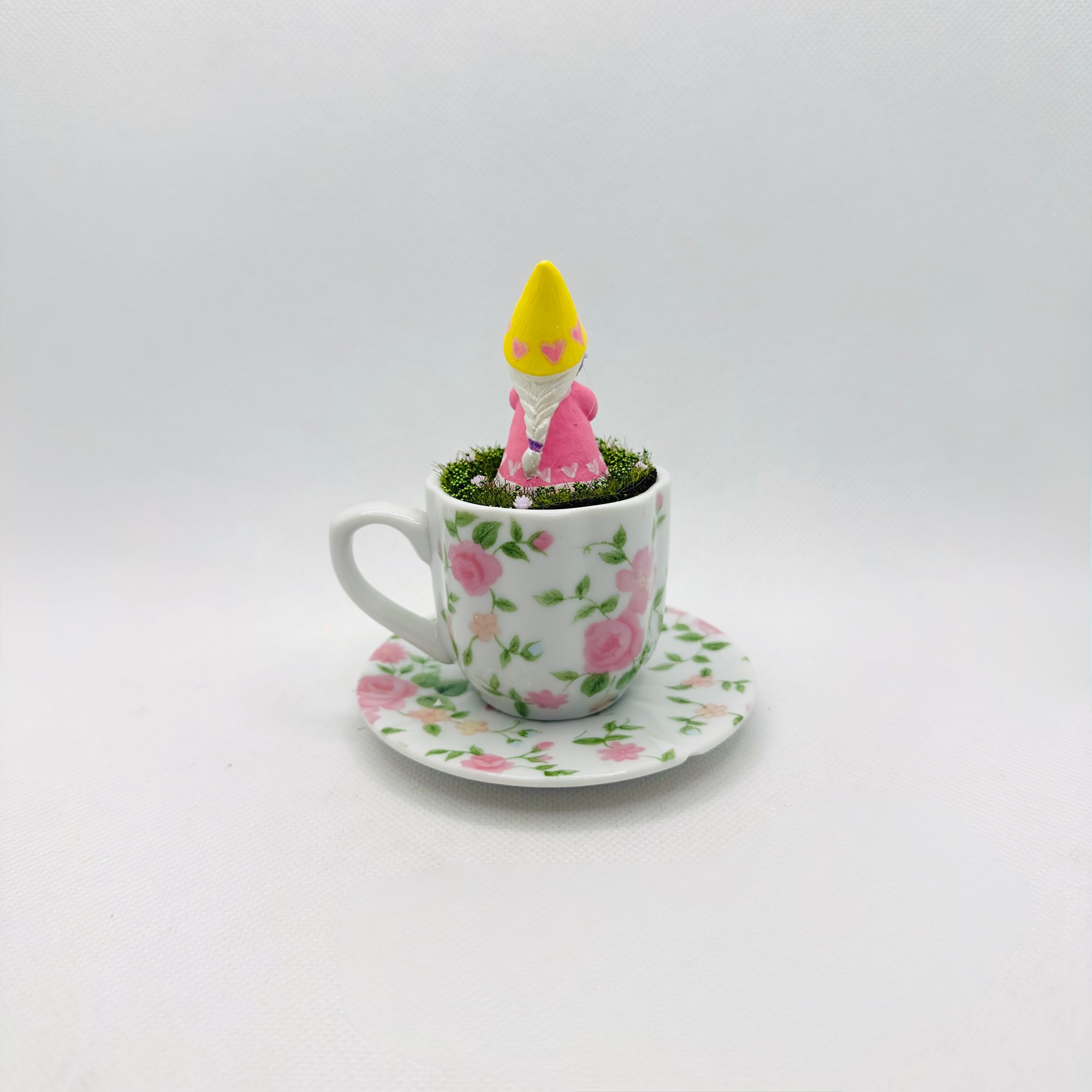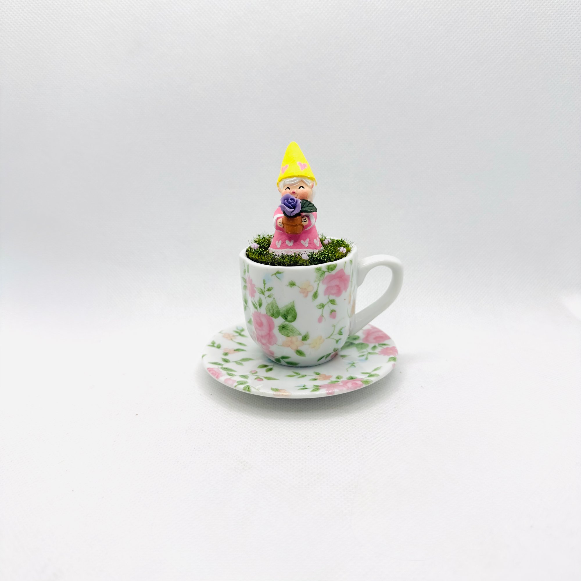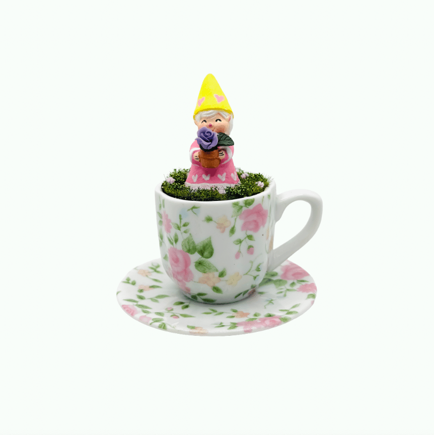 This whimsical springtime Easter tabletop features a charming gnome named Rosy, who is a big fan of roses. Rosy is elegantly tucked into a china tea cup, enhancing the whimsical ambiance of your table. The harmonious blend of old and new elements creates a delightful and enchanting vignette. This piece is one of a kind and will come signed and include a certificate of authenticity.