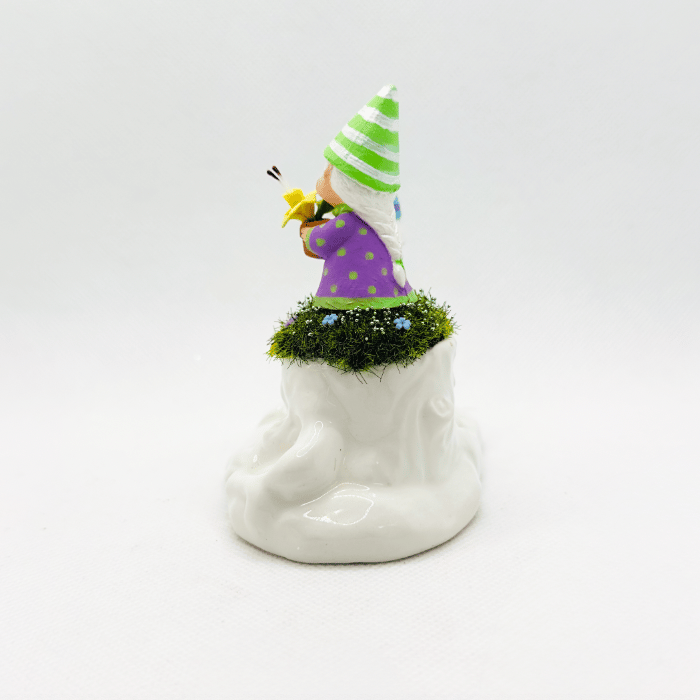 These whimsical Easter Springtime gnomes, Dill and Daphine, are daffodil growers! This adorable couple resides on a found ceramic tree stump piece, which serves as the ideal spot to showcase their prize daffodils. Tammy handpaints, assembles, and creates each gnome, making them one-of-a-kind. This piece is signed and comes with a certificate of authenticity.