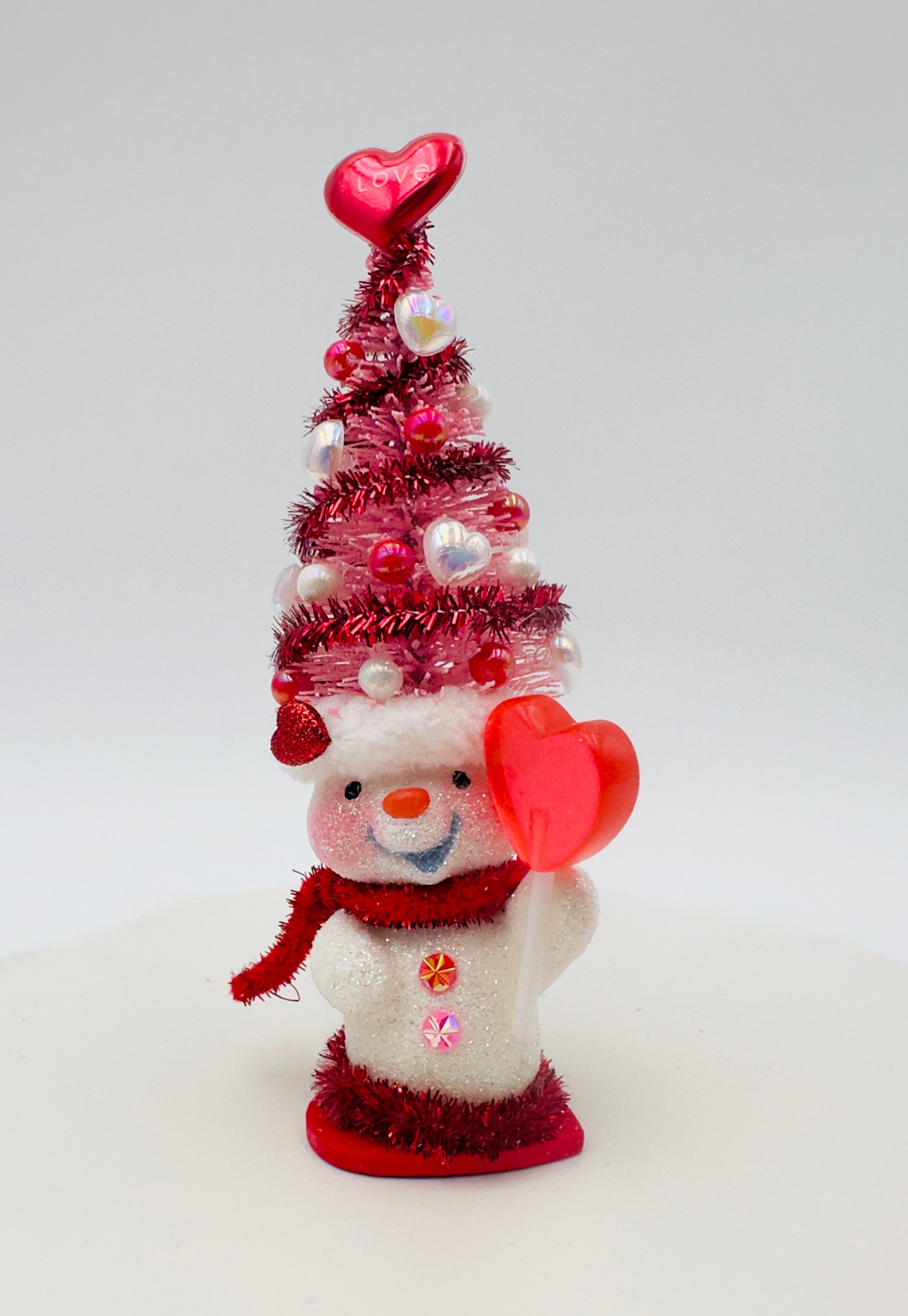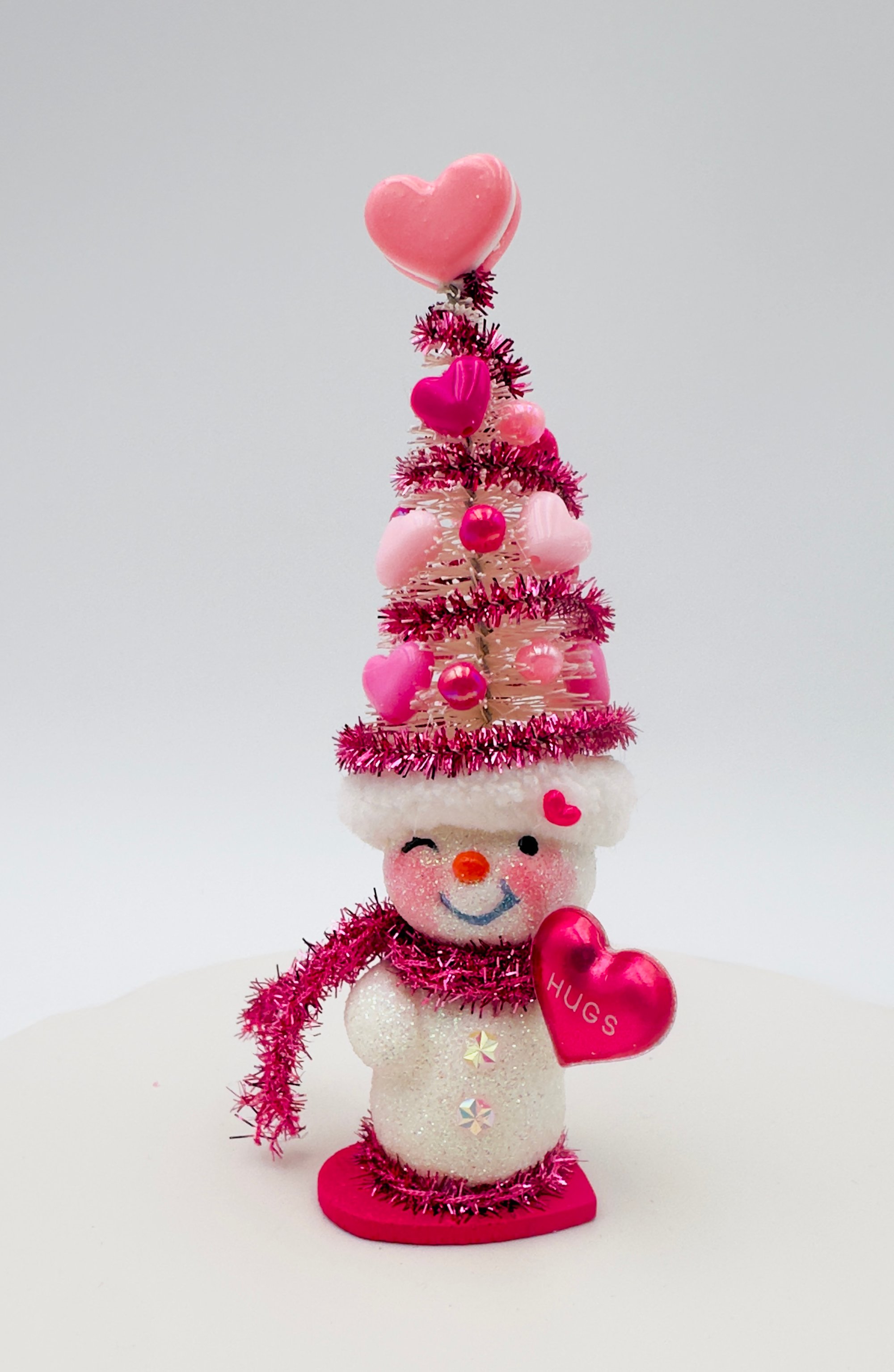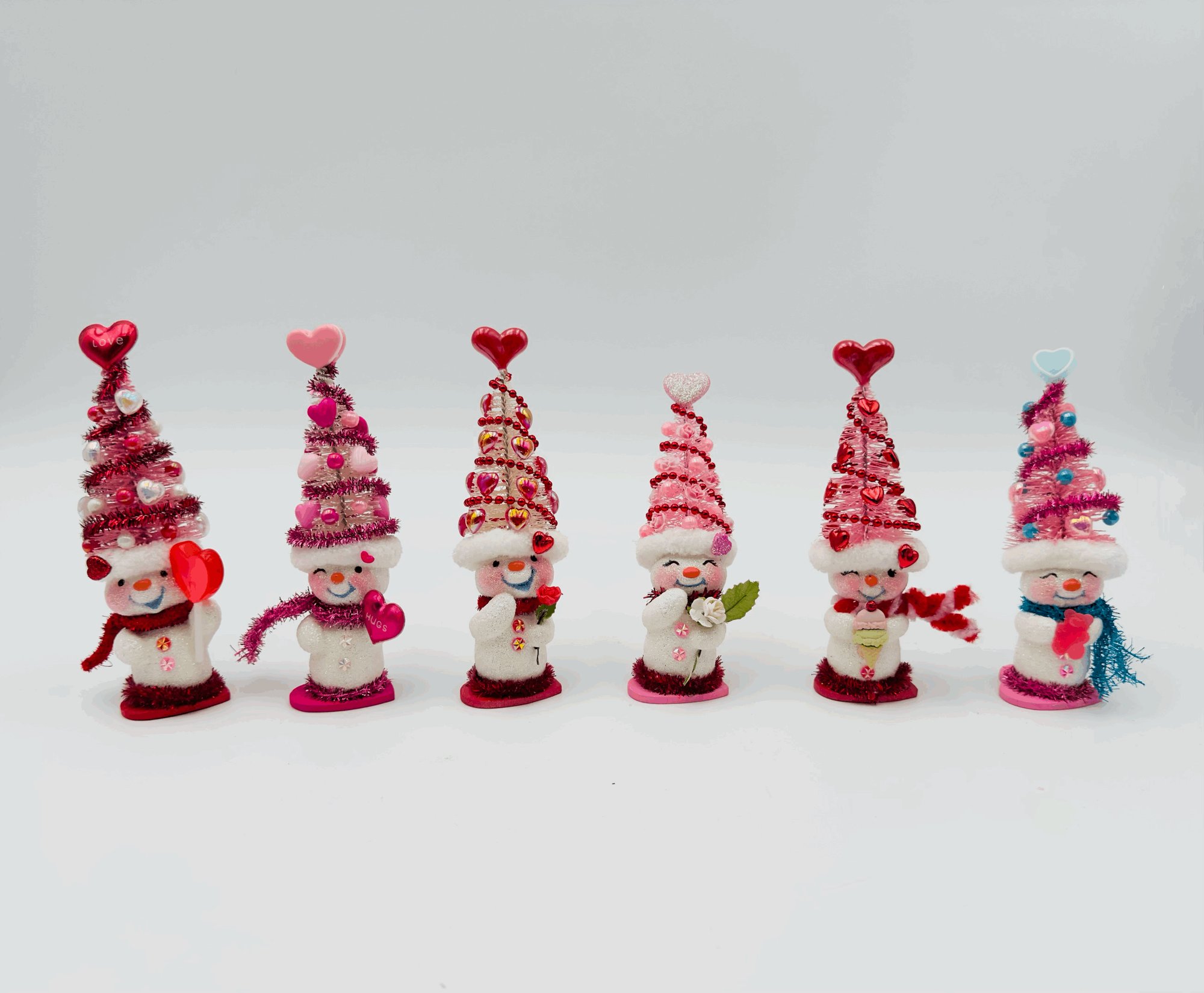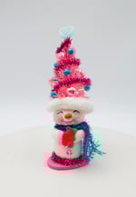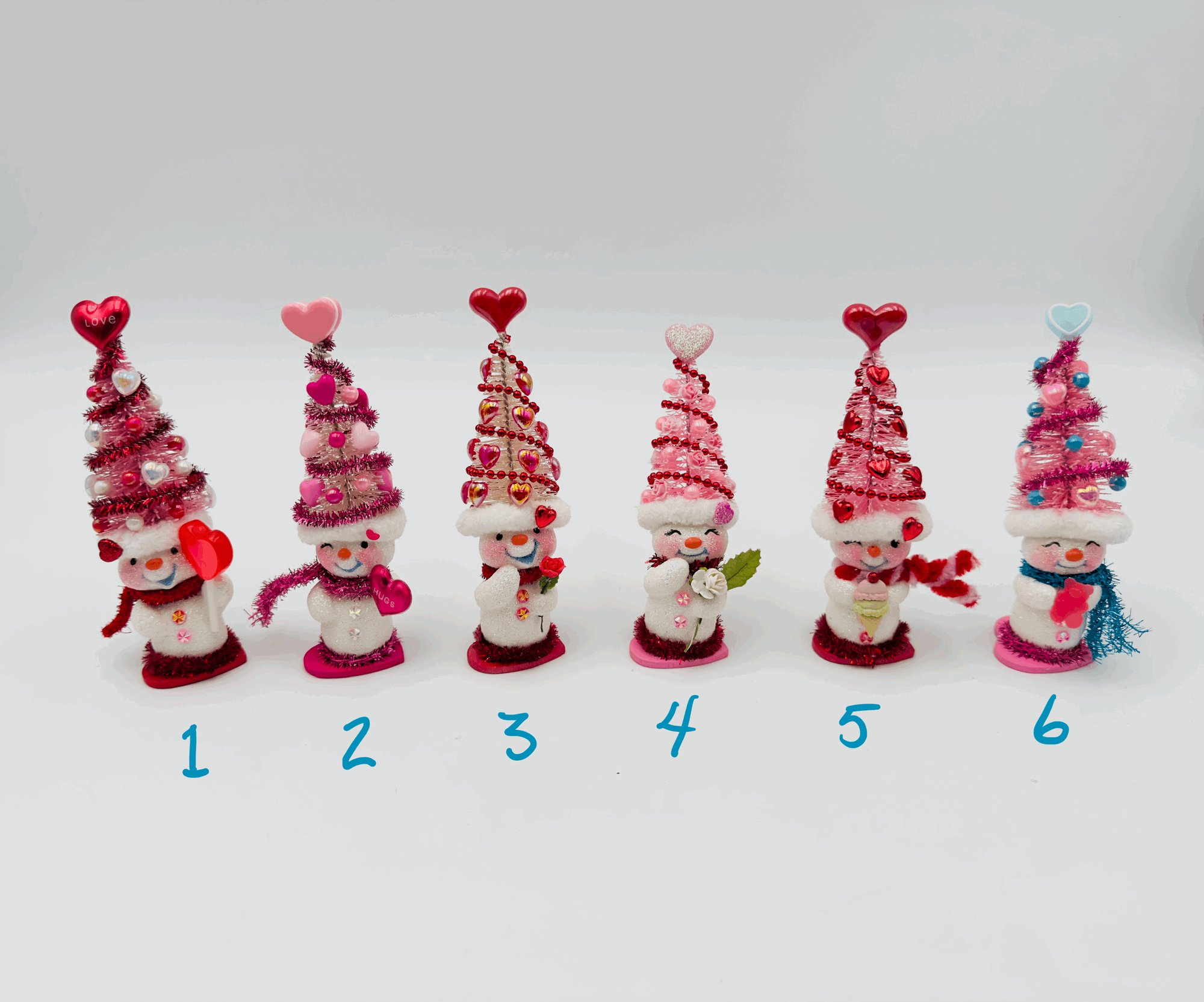 These charming snow people, dressed in their whimsical Valentine's Day tree hats, are all set to celebrate love! Their unique personalities are reflected in their bright smiles and the decorations on their hats, making them the perfect gift for friends and family, or anyone who loves snowmen! Each snowman is one-of-a-kind and created with lots of love and glitter! No others will be made that are exactly the same!