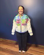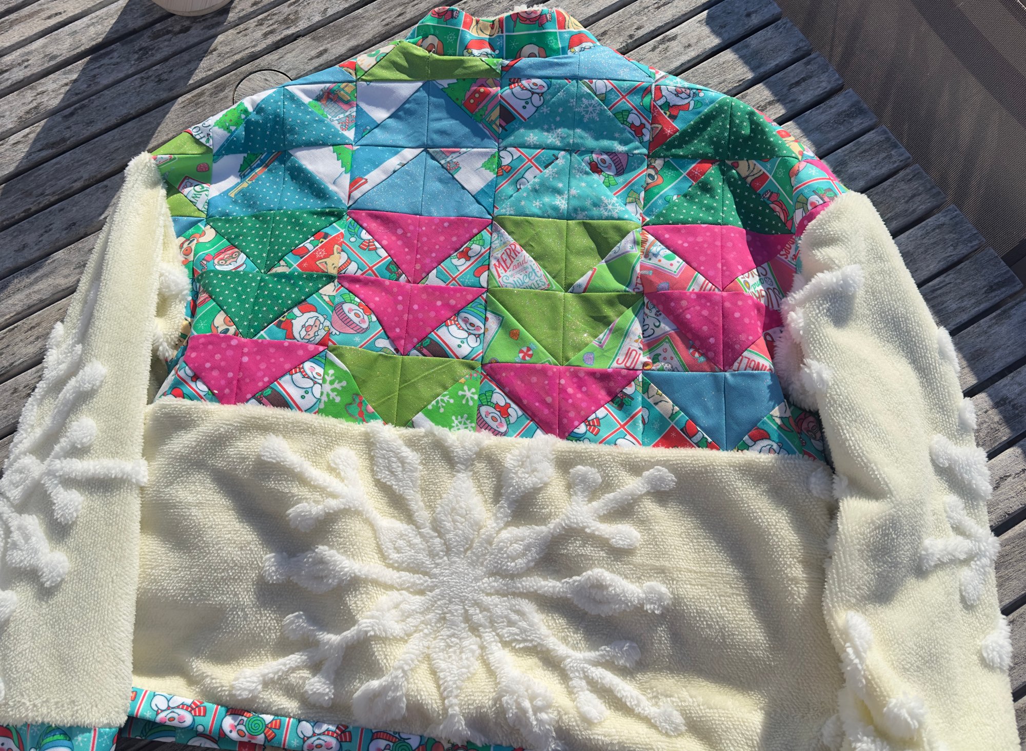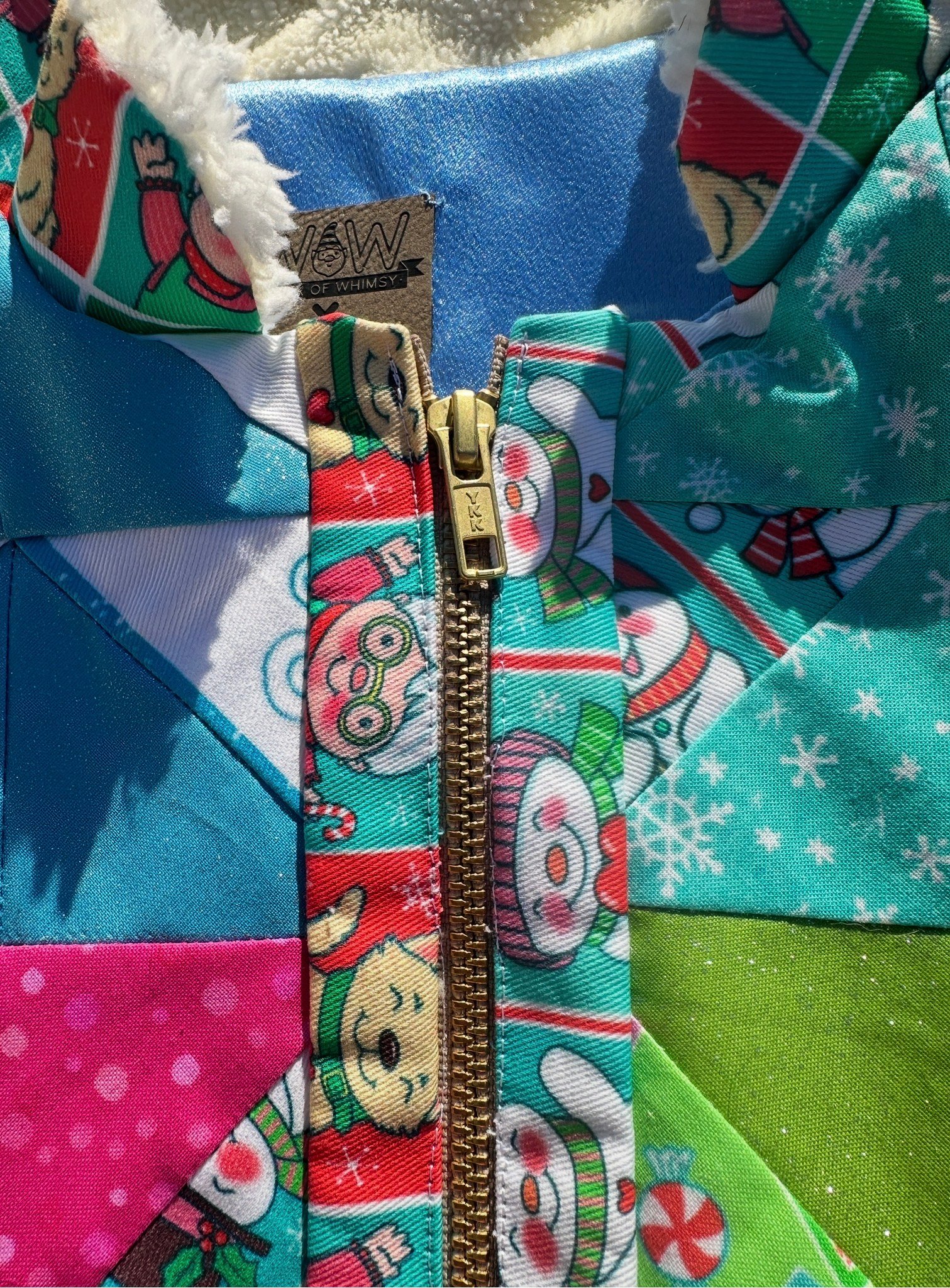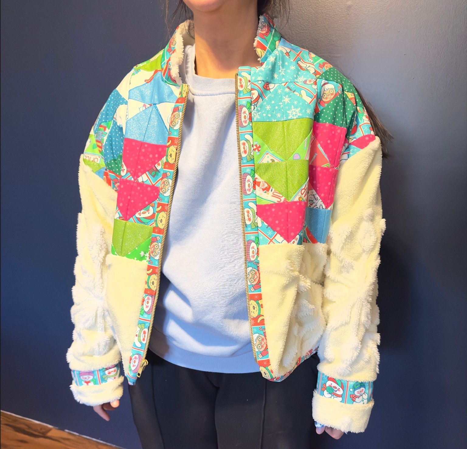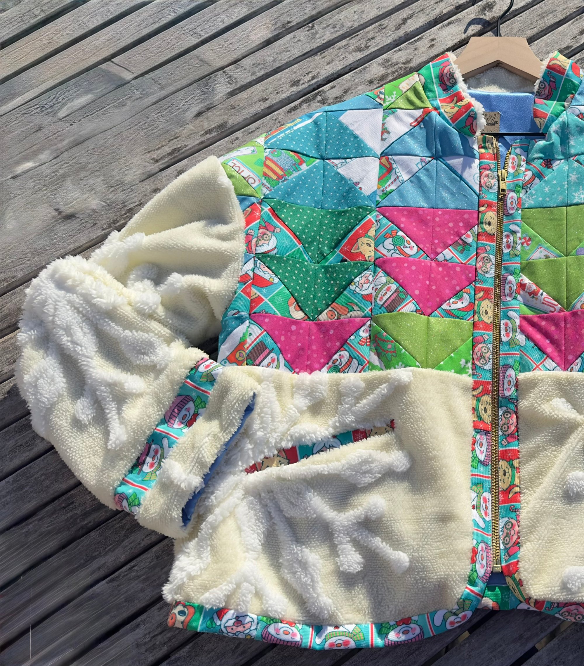 This Work of Whimsy Art Jacket was created in collaboration with Nikki Drew Studio. I am thrilled to share this jacket with you! I collaborated with a highly talented young lady who will soon be my daughter-in-law, Nikki Drew. Nikki is an exceptional quilter who transformed my art fabrics into a quilted fabric, which she then transformed into this exquisite jacket. The details of the jacket are simply breathtaking! The chenille snowflake fabric is incredibly soft to the touch, while the quilted fabric incorporates some glittery fabric that enhances the jacket’s overall beauty. Additionally, the beautiful soft gold zipper showcases the exceptional quality of this jacket.